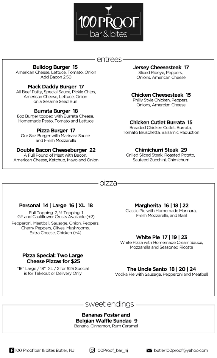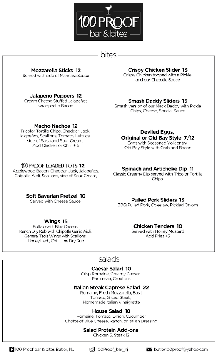 Welcome to 100 Proof Bar and Bites, where the fusion of great food and inviting atmosphere truly shines. This hidden gem, located at 227 Main St, Butler, NJ, offers a unique bar experience with a lively downstairs area, a relaxed outdoor space, and an intimate upstairs lounge.